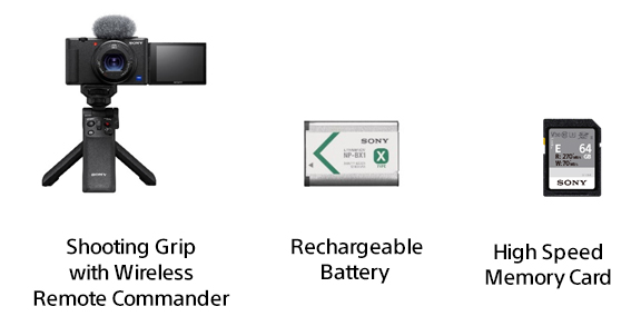 The new ZV-1 comes loaded with accessories meeting the needs of today’s content creators. The vlogger kit accessory incudes a GP-VPT2BT Shooting Grip with Wireless Remote Commander and 64GB Ultra-High-Speed Media Card & an additional Battery NP-BX1.